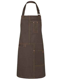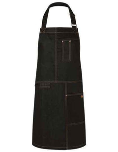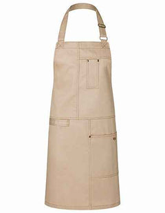 Twill weave, 273 g/m² | Colorfast | Bib apron in twill look with apron fabric ties | Bib strap with buckle for stepless length adjustment | Bronze-plated rivets and contrasting topstitching | Practical fabric loop on the right side for attaching a cashier's halter or tea towel | Left-side pocket (19 x 21 cm) | Washable up to 60 °C