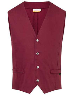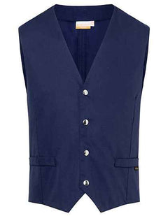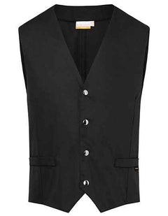 Tissu sergé, 215 g/m² | Finition haut de gamme, prérétréci, couleurs grand teint, entretien facile | Gilet homme coupe ajustée avec pinces | Ceinture dos ajustable par boutons-pression | 2 fausses poches passepoilées | 4 boutons-pression sur la patte de boutonnage | Lavable en machine à 95 °C | Compatible avec le lavage industriel
